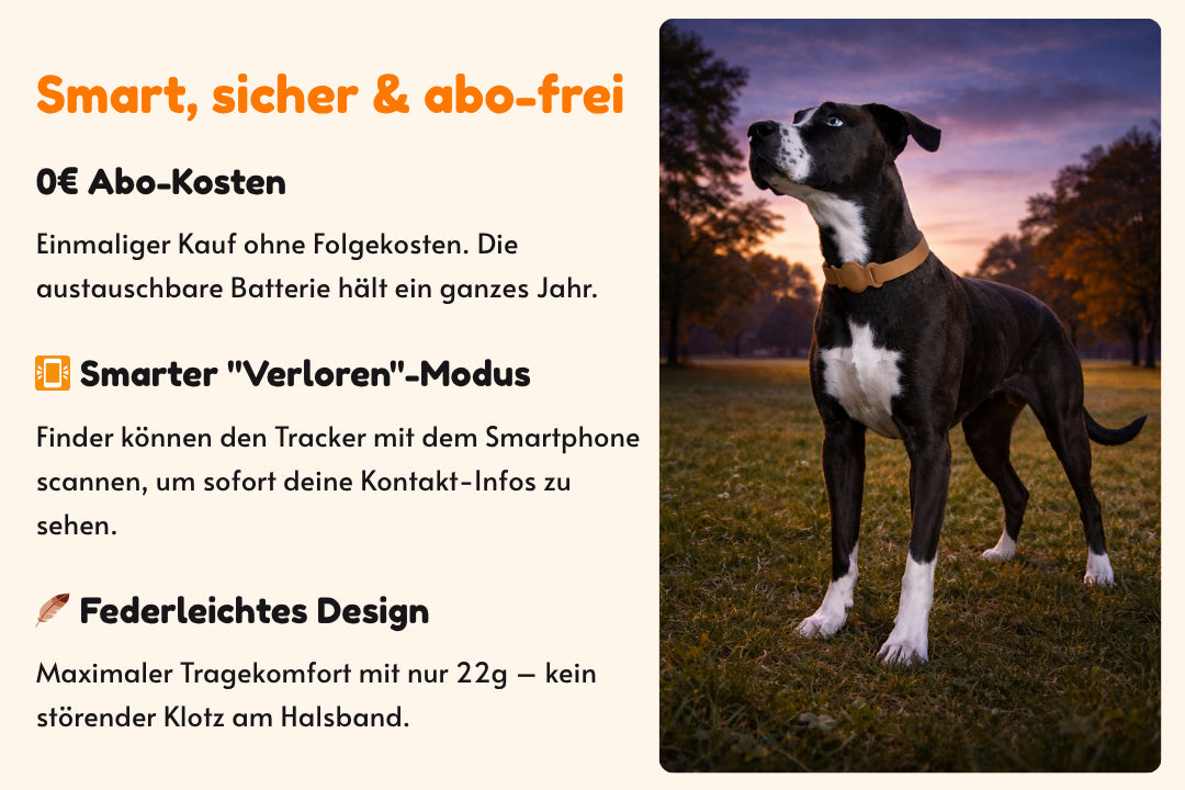 Sichere dir maximale Sicherheit für deinen Hund – ganz ohne Abo-Falle! Der Emmalove Urban Locator ist die smarte Alternative zu teuren GPS-Geräten. Mit nur 22g ist er federleicht und stört deinen Vierbeiner nicht im Alltag. Er nutzt das weltweite Apple und Android "Wo ist?"-Netzwerk, um dir jederzeit den genauen Standort deines Hundes auf dein Smartphone zu senden. Dank der wechselbaren Batterie hast du ein ganzes Jahr lang Ruhe vor dem Ladekabel. Hinweis: Dieser Artikel enthält ausschließlich den Tracker. Ein Halsband oder eine Halterung sind nicht im Lieferumfang enthalten.
